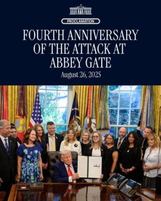 PROCLAMATION: “FOURTH ANNIVERSARY OF THE ATTACK AT ABBEY GATE, 2025” http://www.whitehouse.gov/presidential-actions/2025/08/fourth-anniversary-of-the-attack-at-abbey-gate-2025/