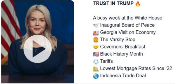 President Trump hosted a Black History Month reception, the inaugural meeting of the Board of Peace, and the National Governor’s Association breakfast. The President also announced the release of all files related to extraterrestrial life and hosted a press conference on the poor Supreme Court decision on tariffs.