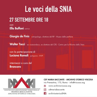 Giovedì alle 17.45 presentazione del libro “Le voci della Snia. Storie dalla Cisa Viscosa di Roma”, Bordeaux editore, presso la Biblioteca Mameli di via del Pigneto 22.
