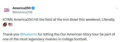 Great to have America250 in Auburn for the Iron Bowl. An iconic rivalry for an iconic celebration. -