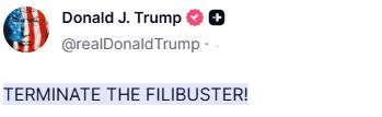 @realDonaldTrumpChuck Schumer, a desperate, crippled politician, who has lost control of the Radical Left Democrats, will make a deal now because he thinks that if he doesn’t, Republicans will TERMINATE THE FILIBUSTER, something which they should do whether he makes a deal or not!!!
