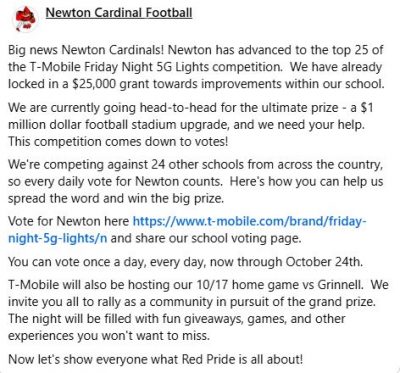 Make sure to vote for Newton High School! Let’s help the Cardinals win that $1M! -