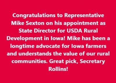 Congratulations to Representative Mike Sexton on his appointment as State Director for @USDA Rural Development in Iowa! Mike has been a longtime advocate for Iowa farmers and understands the value of our rural communities. Great pick, @SecRollins