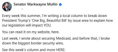 Senator Markwayne Mullin ha inviato un aggiornamento 1 mese fa