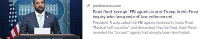 @realDonaldTrumpPatel fired ‘corrupt’ FBI agents in anti-Trump Arctic Frost inquiry who ‘weaponized’ law enforcement: https://justthenews.com/government/courts-law/patel-fired-corrupt-fbi-agents-anti-trump-arctic-frost-inquiry-who-weaponized