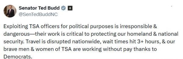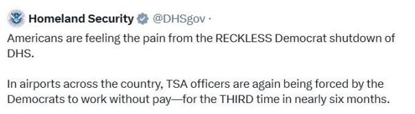 Democrats are willing to use DHS, TSA, FEMA, the Coast Guard, and the American People as pawns in their scheme to defund federal law enforcement and abolish ICE. They’ll do anything to appease their radical left base. https://www.facebook.com/reel/1256421196621932 -