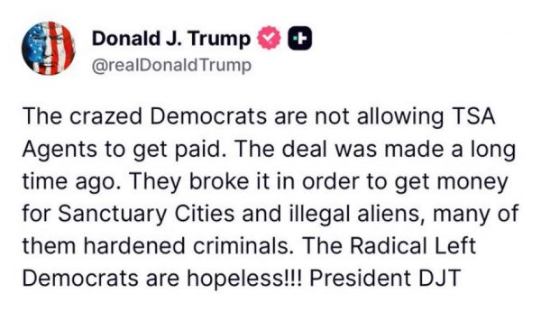 The crazed Democrats are not allowing TSA Agents to get paid. The deal was made a long time ago. They broke it in order to get money for Sanctuary Cities and illegal aliens, many of them hardened criminals. The Radical Left Democrats are hopeless!!! President DJT