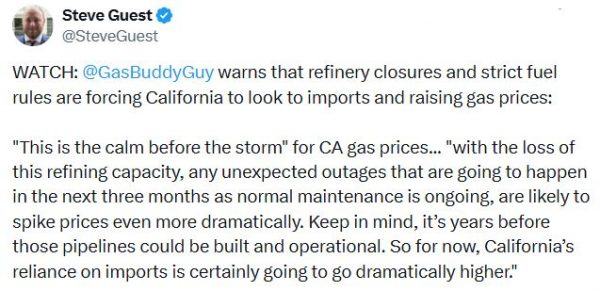 Only in Gavin Newsom’s upside-down world does he brag about California losing refineries and becoming more dependent on foreign fuel. Refineries close. Dependence rises. Californians pay more at the pump. His energy policies are terrible. -