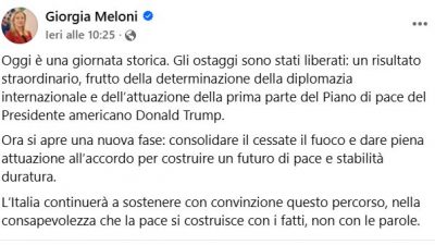 L’accordo raggiunto in Egitto per l’applicazione della prima fase del Piano di pace del Presidente Trump è una straordinaria notizia che apre la strada al cessate il fuoco a Gaza, al rilascio di tutti gli ostaggi e al ritiro delle forze israeliane su linee concordate.